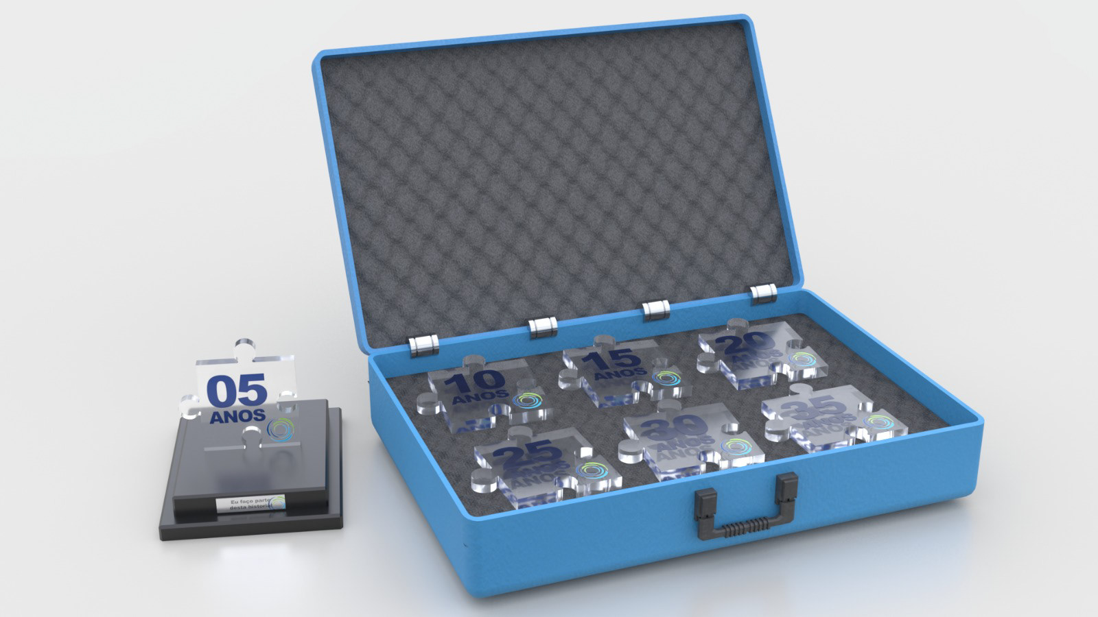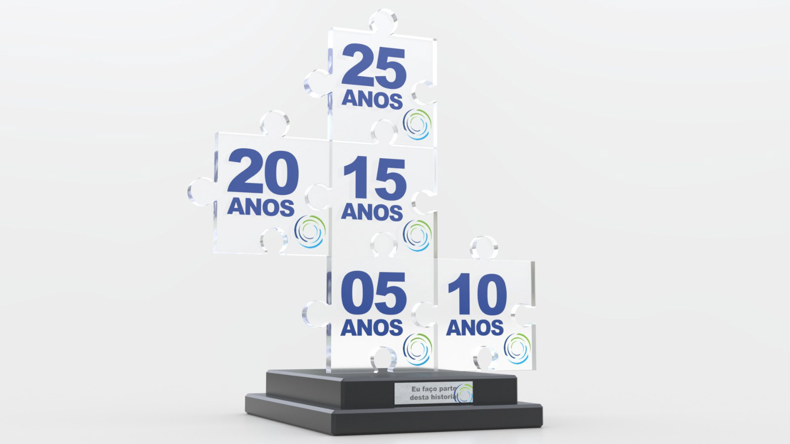 Este troféu de reconhecimento é inspirado no conceito de um quebra-cabeça, cada peça representa um marco de tempo, homenageando o tempo de dedicação dos colaboradores.