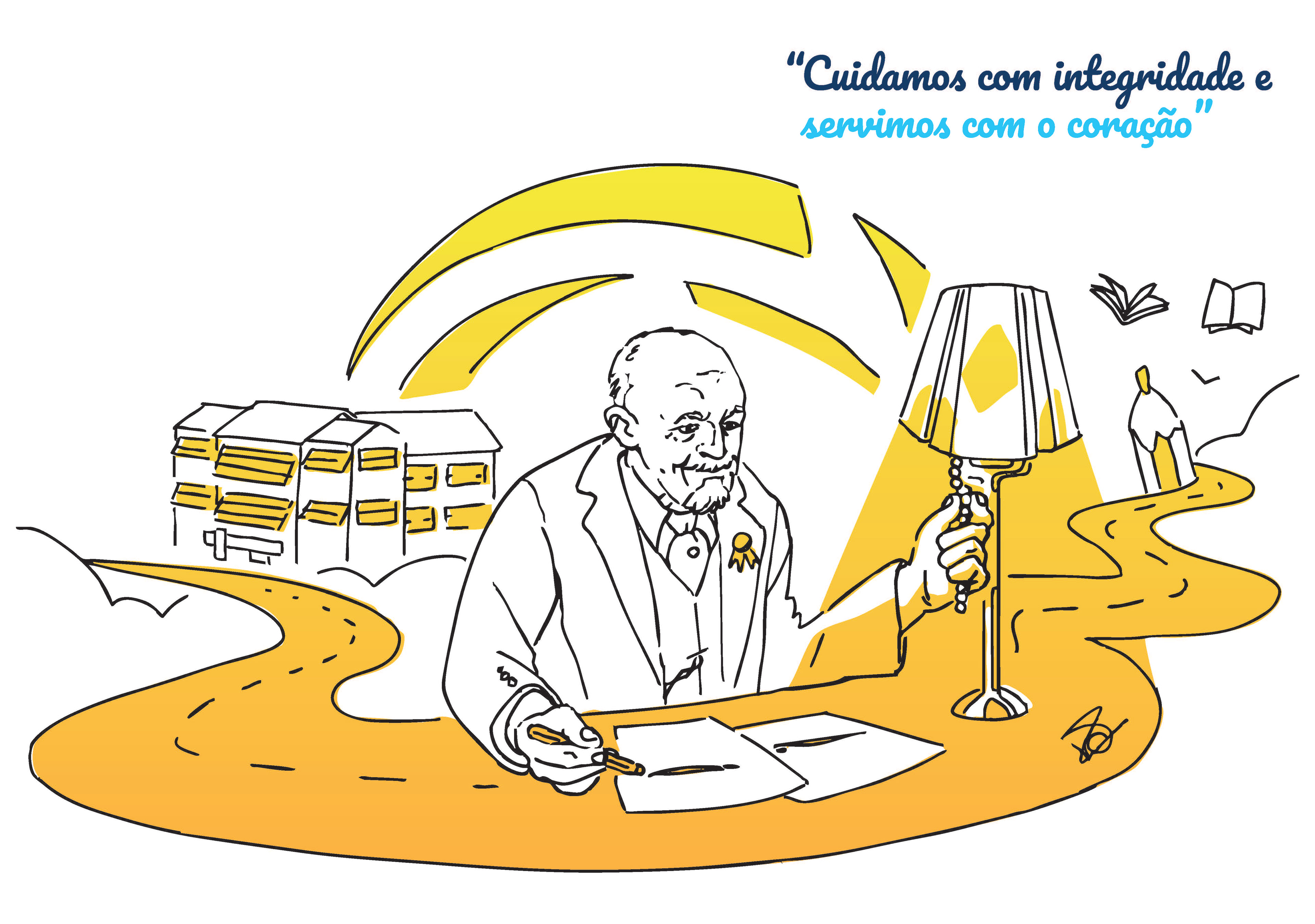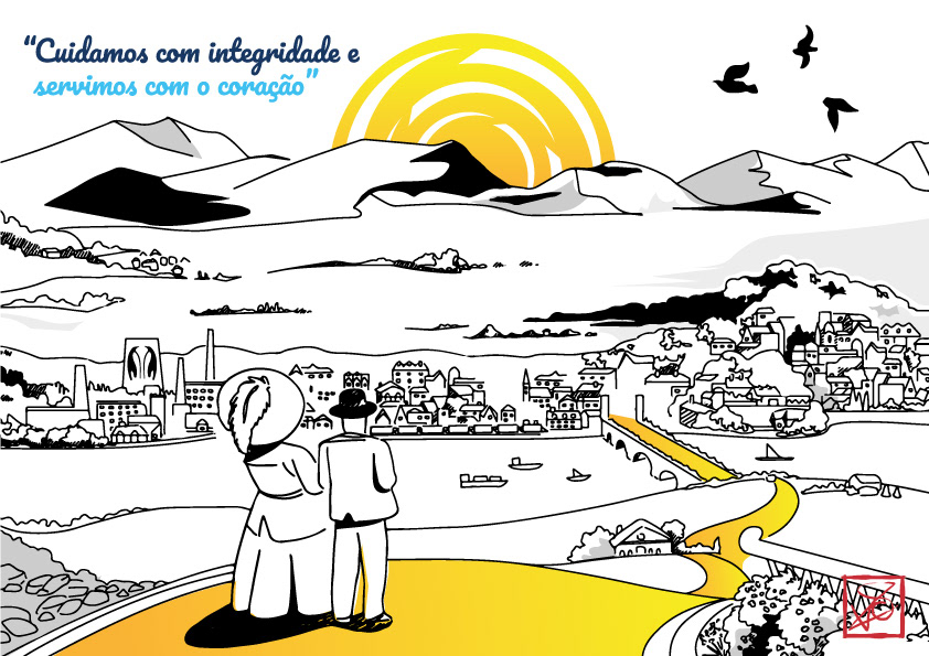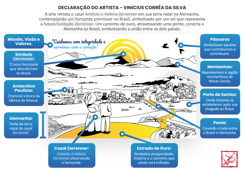 A arte retrata o casal Fundador em sua terra natal na Alemanha, contemplando um horizonte promissor no Brasil, simbolizado por um sol que representa a futura FAHZ.