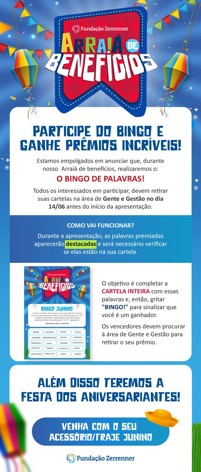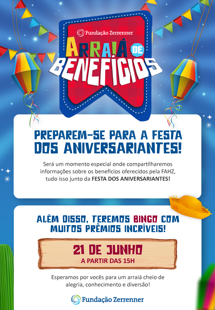 Esse evento uniu clima festivo e informação de forma leve e engajadora. A proposta foi destacar os principais benefícios oferecidos pela empresa aos colaboradores, integrando tudo isso a uma celebração típica de festa junina. Desenvolvi materiais de apoio para ambientação, sinalização, bingo, comunicação visual dos estandes e outros itens que ajudaram a transformar o espaço num evento acolhedor e informativo.